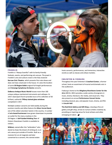 F R A N K L I NFranklin is %u201cAlways Even%u019eul%u201d with its family-friendly fes%u019fvals, events, and performing arts venues. The jewel in Franklin%u2019s arts and culture crown is the fully restored Barrow-Civic Theatre, which presents first-rate shows and does not have a bad seat in the house. It is also the loca%u019fon of some Oil Region Ballet original full-length performances and Venango Symphony Orchestra concerts.DeBence An%u019fque Music World houses more than 100 unique an%u019fque mechanical instruments and calliopes. St. John%u2019s Episcopal Church provides tours of its collec%u019fon of 30 brilliant, authen%u019fc Tiffany stained glass windows completed in 1917. Mul%u019fple outdoor concerts are held weekly during the summer months and o%u014cen feature the Silver Cornet Band, one of the oldest volunteer bands in the country. A number of arts-based businesses have grown downtown to provide an outlet for the many crea%u019fves in the Oil Region. A Self-Guided Walking Tour of Historic Downtown Franklin is available to visitors. Wildcat, named a%u014cer the %u201cwildca%u01a9ers%u201d who dared to chase the dream of striking oil, is an arts venue just outside of Franklin. Built as a mansion for an oil magnate and later converted to a convent, this storied estate hosts concerts, performances, and immersive, interac%u019fve events as well as classes and ar%u019fsan markets.E M L E N T O N & F O X B U R GThroughout the year Emlenton%u2019s Crawford Center, a former school, hosts an assortment of musical and drama%u019fc acts in the auditorium.Foxburg is home to the Allegheny RiverStone Center for the Arts (ARCA). ARCA provides a wide variety of programs in music, drama, literature, the media, and visual arts. They also present an annual Performance Concert Seriesincluding classical, jazz, and popular music, drama, and film in Lincoln Hall.The Red Brick Gallery and Gi%u014c Shop, a bou%u019fque fine art gallery and gi%u014c shop, strives to nurture ar%u019fs%u019fc crea%u019fvity by providing an inspiring venue for local ar%u019fsans and other emerging art talent.23Barrow-Civic Theatre
