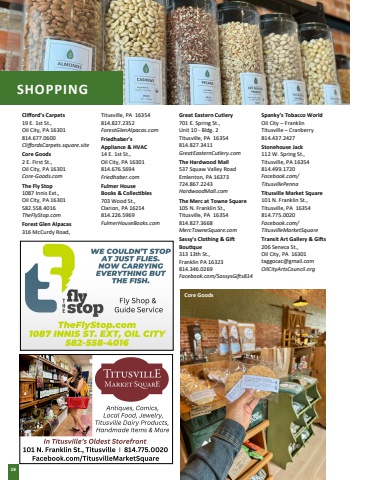 Clifford%u2019s Carpets19 E. 1st St., Oil City, PA 16301814.677.0600CliffordsCarpets.square.siteCore Goods2 E. First St., Oil City, PA 16301Core-Goods.comThe Fly Stop1087 Innis Ext., Oil City, PA 16301582.558.4016TheFlyStop.comForest Glen Alpacas316 McCurdy Road, Titusville, PA 16354814.827.2352ForestGlenAlpacas.comFriedhaber%u2019s Appliance & HVAC14 E. 1st St., Oil City, PA 16301814.676.5694Friedhaber.comFulmer House Books & Collec%u019fbles703 Wood St., Clarion, PA 16214814.226.5969FulmerHouseBooks.com28SHOPPINGGreat Eastern Cutlery701 E. Spring St., Unit 10 - Bldg. 2Titusville, PA 16354814.827.3411GreatEasternCutlery.comThe Hardwood Mall537 Squaw Valley RoadEmlenton, PA 16373724.867.2243HardwoodMall.comThe Merc at Towne Square105 N. Franklin St., Titusville, PA 16354814.827.3668MercTowneSquare.comSassy's Clothing & Gi%u014c Bou%u019fque313 13th St., Franklin PA 16323814.346.0269 Facebook.com/SassysGi%u014cs814Spanky%u2019s Tobacco WorldOil City %u2013 FranklinTitusville %u2013 Cranberry814.437.2427Stonehouse Jack112 W. Spring St., Titusville, PA 16354814.499.1720 Facebook.com/TitusvillePennaTitusville Market Square101 N. Franklin St., Titusville, PA 16354814.775.0020Facebook.com/TitusvilleMarketSquareTransit Art Gallery & Gi%u014cs206 Seneca St., Oil City, PA 16301taggocac@gmail.comOilCityArtsCouncil.orgCore Goods