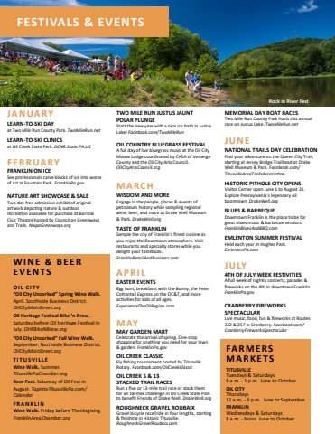J A N UA RYLEARN-TO-SKI DAY at Two Mile Run County Park. TwoMileRun.netLEARN-TO-SKI CLINICS at Oil Creek State Park. DCNR.State.PA.US F E B R UA RYFRANKLIN ON ICE See professionals carve blocks of ice into works of art at Fountain Park. FranklinPa.gov NATURE ART SHOWCASE & SALE Two-day free admission exhibit of original artwork depic%u019fng nature & outdoor recrea%u019fon available for purchase at Barrow Civic Theatre hosted by Council on Greenways and Trails. NwpaGreenways.org TWO MILE RUN JUSTUS JAUNT POLAR PLUNGEStart the new year with a nice ice bath in Justus Lake! Facebook.com/TwoMileRunOIL COUNTRY BLUEGRASS FESTIVAL A full day of live bluegrass music at the Oil CityMoose Lodge coordinated by CASA of Venango County and the Oil City Arts Council. OilCityArtsCouncil.org M A R C HWISDOM AND MORE Engage in the people, places & events of petroleum history while sampling regional wine, beer, and more at Drake Well Museum & Park. DrakeWell.org TASTE OF FRANKLINSample the city of Franklin%u2019s finest cuisine as you enjoy the Downtown atmosphere. Visit restaurants and specialty stores while you delight your tastebuds. FranklinRetailAndBusiness.comA P R I LEASTER EVENTS Egg hunt, breakfasts with the Bunny, the Peter Co%u01a9ontail Express on the OC&T, and more ac%u019fvi%u019fes for kids of all ages. ExperienceTheOilRegion.com M AYMAY GARDEN MART Celebrate the arrival of spring. One-stop shopping for anything you need for your lawn & garden. FranklinPa.gov OIL CREEK CLASSIC Fly fishing tournament hosted by Titusville Rotary. Facebook.com/OilCreekClassicOIL CREEK 5 & 13 STACKED TRAIL RACES Run a five or 13-mile trail race or stack them for an 18-mile challenge in Oil Creek State Park to benefit Friends of Drake Well. DrakeWell.orgROUGHNECK GRAVEL ROUBAIX Gravel bicycle race/ride in four lengths, star%u019fng & finishing in Historic Titusville. RoughneckGravelRoubaix.comMEMORIAL DAY BOAT RACES Two Mile Run County Park hosts this annual race on Justus Lake. TwoMileRun.netJ U N ENATIONAL TRAILS DAY CELEBRATIONFind your adventure on the Queen City Trail, star%u019fng at Jersey Bridge Trailhead at Drake Well Museum & Park. Facebook.com/TitusvilleAreaTrailsAssocia%u019fonHISTORIC PITHOLE CITY OPENSVisitor Center open June 1 to August 31. Explore Pennsylvania%u2019s legendary oil boomtown. DrakeWell.org BLUES & BARBEQUE Downtown Franklin is the place to be for great blues music & barbecue vendors. FranklinBluesAndBBQ.com EMLENTON SUMMER FESTIVAL Held each year at Hughes Park. EmlentonPa.com J U LY4TH OF JULY WEEK FESTIVITIES A full week of nightly concerts, parades & fireworks on the 4th in downtown Franklin. FranklinPa.govCRANBERRY FIREWORKS SPECTACULAR Live music, food, fun & fireworks at Routes 322 & 257 in Cranberry. Facebook.com/CranberryFireworksSpectacular28FA R M E R S M A R K E T STITUSVILLETuesdays & Saturdays9 a.m. - 1 p.m. June to OctoberOIL CITYThursdays11 a.m. - 6 p.m. June to SeptemberFRANKLINWednesdays & Saturdays8 a.m. - Noon June to OctoberW I N E & B E E R E V E N T SO I L C I T Y%u201cOil City Uncorked%u201d Spring Wine Walk. April. Southside Business District.OilCityMainStreet.orgOil Heritage Fes%u019fval Bike %u2019n Brew. Saturday before Oil Heritage Fes%u019fval in July. OHFBikeNBrew.org%u201cOil City Uncorked%u201d Fall Wine Walk. September. Northside Business District.OilCityMainStreet.orgT I T U S V I L L EWine Walk. Summer. TitusvillePaChamber.orgBeer Fest. Saturday of Oil Fest in August. TapIntoTitusvillePa.com/CalendarF R A N K L I NWine Walk. Friday before Thanksgiving. FranklinAreaChamber.orgFESTIVALS & EVENTSRock in River Fest
