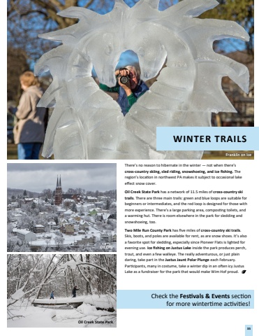 35There%u2019s no reason to hibernate in the winter %u2014 not when there%u2019s cross-country skiing, sled riding, snowshoeing, and ice fishing. The region%u2019s loca%u019fon in northwest PA makes it subject to occasional lake effect snow cover.Oil Creek State Park has a network of 11.5 miles of cross-country ski trails. There are three main trails: green and blue loops are suitable for beginners or intermediates, and the red loop is designed for those with more experience. There%u2019s a large parking area, compos%u019fng toilets, and a warming hut. There is room elsewhere in the park for sledding and snowshoeing, too.Two Mile Run County Park has five miles of cross-country ski trails. Skis, boots, and poles are available for rent, as are snow shoes. It%u2019s also a favorite spot for sledding, especially since Pioneer Flats is lighted for evening use. Ice fishing on Justus Lake inside the park produces perch, trout, and even a few walleye. The really adventurous, or just plain daring, take part in the Justus Jaunt Polar Plunge each February. Par%u019fcipants, many in costume, take a winter dip in an o%u014cen icy Justus Lake as a fundraiser for the park that would make Wim Hof proud.Check the Fes%u019fvals & Events sec%u019fon for more winter%u019fme ac%u019fvi%u019fes!WINTER TRAILS Franklin on IceOil CityOil Creek State Park