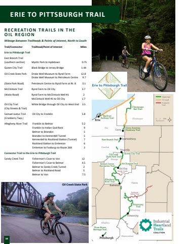 R E C R E AT I O N T R A I L S I N T H E O I L R E G I O NMileage Between Trailheads & Points of Interest, North to SouthTrail/Connector Trailhead/Point of Interest MilesErie to Pi%u01a9sburgh TrailEast Branch Trail(southern sec%u019fon) Mys%u019fc Park to Hydetown 0.75Queen City Trail Black Bridge to Jersey Bridge 1.44Oil Creek State Park Drake Well Museum to Rynd Farm 12.8 Drake Well Museum to Petroleum Centre 9.7(State Park Road) Petroleum Centre to Rynd Farm at Rt. 8 3.1McClintock Trail Rynd Farm to Oil City 3.7(Waitz Road) Rynd Farm to McClintock Well #1 2 McClintock Well #1 to Oil City 1.7Oil City Trail White Bridge through Oil City to West End 3.5(City Streets & Trail)Samuel Justus Trail Oil City to Franklin 5.8(Cranberry Twp.)Allegheny River Trail Franklin to Belmar 5.2 Franklin to Indian God Rock 9 Belmar to Brandon 5 Brandon to Kennerdell Tunnel 5 Kennerdell to Rockland Sta%u019fon (Tunnel) 7 Rockland Sta%u019fon to Emlenton 6 Emlenton to Foxburg via Route 268 3Connector Trail to the Erie to Pi%u01a9sburgh TrailSandy Creek Trail Fisherman%u2019s Cove to Van 12 Fisherman%u2019s Cove to Belmar 4.5 Belmar to Sandy Creek Tunnel 2 Belmar to Rockland Road 3 Belmar to Van 7.5 38ERIE TO PITTSBURGH TRAILOil Creek State Park