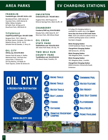 F R A N K L I NFranklinPA.gov 814.437.1619 x 123Bandstand Park, 1160 Liberty St.Fountain Park, 1220 Liberty St.Miller-Sibley Complex & Public Pool, 30 Spruce St.Riverfront Park, 200 Ninth St.T I T U S V I L L ECityOfTitusvillePA.gov 814.827.5300Burgess Park, 714 E. Main St.Ed Myer Sports Complex, 516 Allen St.Roberts Grove, 513 N. 1st St.Scheide Park & Gazebo, S. Perry St.O I L C I T YOilCity.org 814.678.3012Hasson Park & James A. Nelles Memorial Pool, 136 Park Ave.Justus Park, 2 Seneca St.Oil City Marina, 10 Wyllis St.Town Square, Center & Seneca St.42A 2-plug, EV charging sta%u019fon is available for public use in the Egbert Farm Day Use Area of Oil Creek State Park. Users are asked to please move to another parking space once a vehicle has been charged. Blink Charging Sta%u019fon11430 Hydetown Road, TitusvilleChargePoint Charging Sta%u019fon 100 Seneca St., Oil CityBlink Charging Sta%u019fon768 Allegheny Blvd., FranklinBlink Charging Sta%u019fon797 Allegheny Blvd., FranklinChargePoint Charging Sta%u019fon6406 Emlenton Clintonville Road, EmlentonAREA PARKS EV CHARGING STATIONSE M L E N TO NEmlentonPA.com 742.867.8611Hughes Park, 910 Prospect St.Mineral Springs Park, Main St./Rt. 38C R A N B E R R YCranberryTWP.org 814.676.8812Moody Park, 2581 State Rt. 257Morrison Park, 293 Allison RoadO I L C R E E K S TAT E PA R K VisitPaParks.com 814.676.5915305 State Park Road, Oil City, PAT W O M I L E R U N C O U N T Y PA R K TwoMileRun.net 814.676.6116471 Beach Road, Franklin, PA