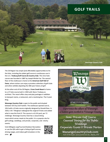 The Oil Region has ample (and affordable) opportuni%u019fes to hit the links, including the oldest golf course in con%u019fnuous use in the U.S.: Foxburg Golf Course & Country Club. This nine-hole course was founded in 1887 by Joseph Mickle Fox. The second floor of the clubhouse is home to the American Golf Hall of Fame, where visitors can enjoy a priceless collec%u019fon of golf clubs and other exhibits depic%u019fng the 400-year history of golf.At the other end of the Oil Region, Cross Creek Resort is home to a 27-hole course built in 1959 with Wynn Tredway as architect. The resort offers stay-and-play packages in addi%u019fon to banquet rooms, a restaurant, and a revolving bar, The Crystal Ring.Wanango Country Club is open to the public and situated between Oil City and Franklin. The clubhouse opened June 6, 1914 with a 9-hole course originally designed by Donald Ross. In 1920, A.W. Tillinghast redesigned the original 9 holes and added what is now the front 9. The course is a 6,124 yard, par 72 challenge. Wanango Country Club has a casual dining room which serves meals to the public. It is a popular site for golf ou%u019fngs, weddings, and private, corporate, and charityevents.Visit OilRegion.org/Tourism/Outdoor-Recrea%u019fon or use the QR code to get a lis%u019fng of golf courses, driving ranges, and indoor golf simulators in the area.GOLF TRAILSWanango Country Club43