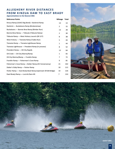 45A L L E G H E N Y R I V E R D I S TA N C E SF R O M K I N Z UA D A M TO E A S T B R A DY Approxima%u019fons to the Nearest MileReference Points Mileage Total Kinzua Ramp (USACE Big Bend)%u2014Starbrick RampStarbrick %u2014 Buckaloons Ramp (Brokenstraw)Buckaloons %u2014 Bonnie Brea Ramp (Bimber Run)Bonnie Brea Ramp %u2014 Tidioute (Tidioute Ramp)Tidioute Ramp %u2014 West Hickory Launch (SR 127)West Hickory %u2014 Tionesta Ramp (Tubbs Run)Tionesta Ramp %u2014 Tionesta Lighthouse RampTionesta Lighthouse %u2014 President Ramp (in process)President Ramp %u2014 Oil City RapidsOil Creek %u2014 Oil City Marina/RampOil City Marina/Ramp %u2014 Franklin RampFranklin Ramp %u2014 Fisherman%u2019s Cove RampFisherman%u2019s Cove Ramp %u2014Do%u01a9er Ramp (AV Conservancy)Do%u01a9er%u2019s Eddy Ramp %u2014 Parker RampParker Ramp %u2014 East Brady Boat Ramp (Upstream SR 68 Bridge)East Brady Ramp %u2014 Lock & Dam #9 13 132 1513 282 308 385 431 448 5212 641 657 729 8121 10210 11214 1267 133Justus LakeAllegheny River